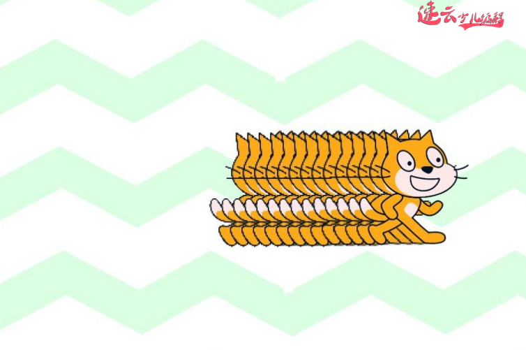 下面我们来试一试另一种作图方式——图章绘图。图章积木的原理是,在舞台上动态的留下一个复本,但这个复本无法移动,也不能对它进行编辑,可以通过“全部擦除”来进行清除。大家试一下编写下面这个程序,观察一下舞台上的效果。