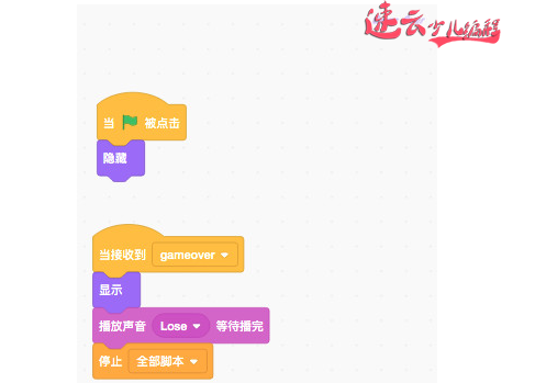 当接收到”gameover"消息时(还记得吗,“gameover”消息是网球落到屏幕外面发出来的),显示该界面,同时播放Lose声音文件,然后停止全部脚本